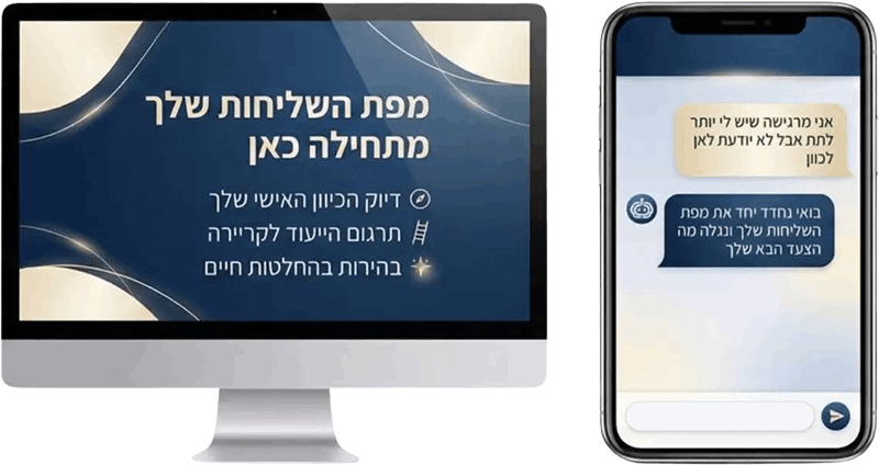 והיום? אחרי שעזרתי למעל 1,500 נשים בישראל למצוא את הייעוד שלהן מבלי לעזוב את הקריירה הנוכחית ומבלי לחכות לפנסיה כדי למצוא את השליחות, אני גאה להציג בפנייך את התכנית הראשונה מסוגה: